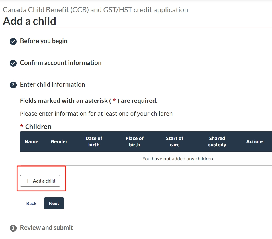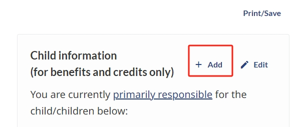 3. 进入Benefits and credits页面后,在Child information里点击“+ Add”