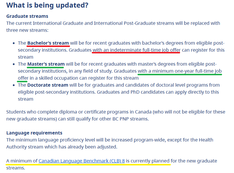 目前公布的政策概况如下: 另外特别被提及的是申请人的语言能力。预计新政的语言要求将是CLB8(即雅思听力7.5,阅读6.5,口语6.5,写作6.5)。 BC 省新的毕业生省提名政策整体来说,增加了对语言的要求。此外: 1. 有利于本科毕业生,毕业后找到长期全职工作即可申请。 2. 对硕士毕业生则有利有弊: 一方面放开了指定院校和专业申请,能够惠及更多申请人; 另一方面增加了工作要求,给本来毕业后即可申请的申请人增加了难度; 3. 对博士毕业生没有改变,仍然无需工作即可申请。 对其他非学位(本科,硕士,博士)的毕业生来说,BC省提名难度依然难于上青天。 |